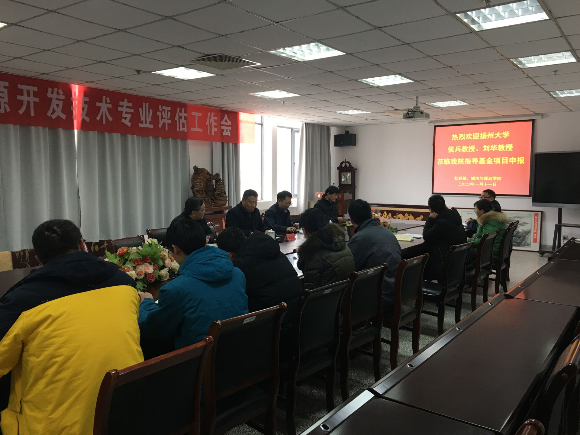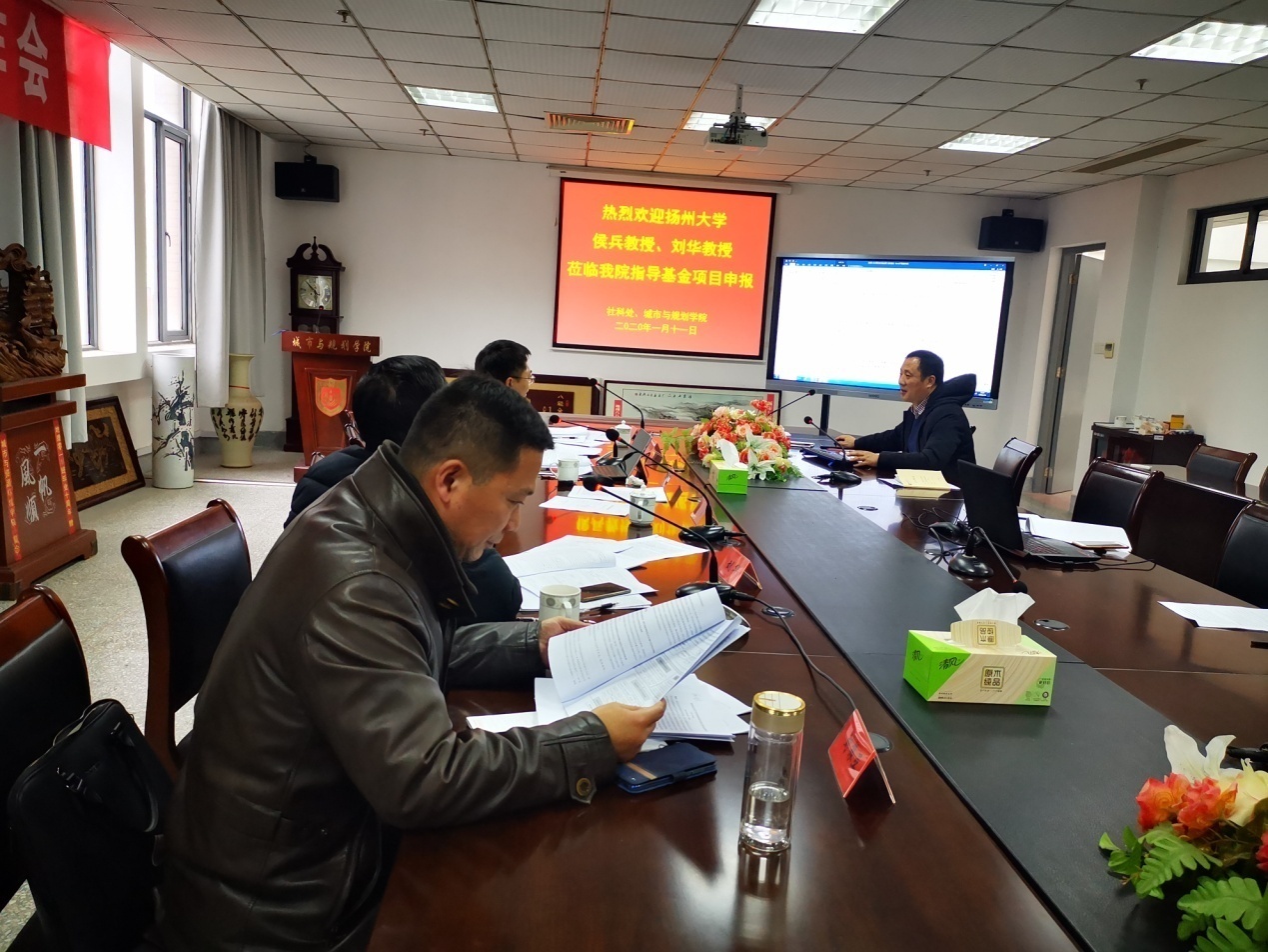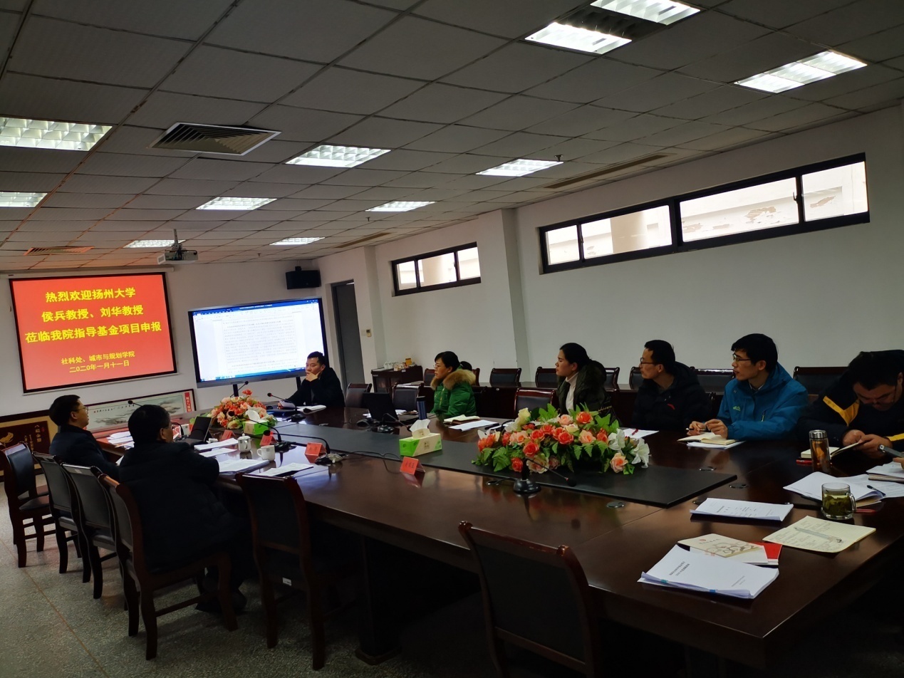 1月11日,扬州大学侯兵教授、刘华教授受邀到我院指导国家基金项目申报工作,研讨会在学院A410会议室举行,社科处处长陈义海、副处长刘振亚亲临指导,会议由院长陈洪全主持,副院长李传武、副书记吴恒仲和申报国家基金的全体老师参加了研讨会。