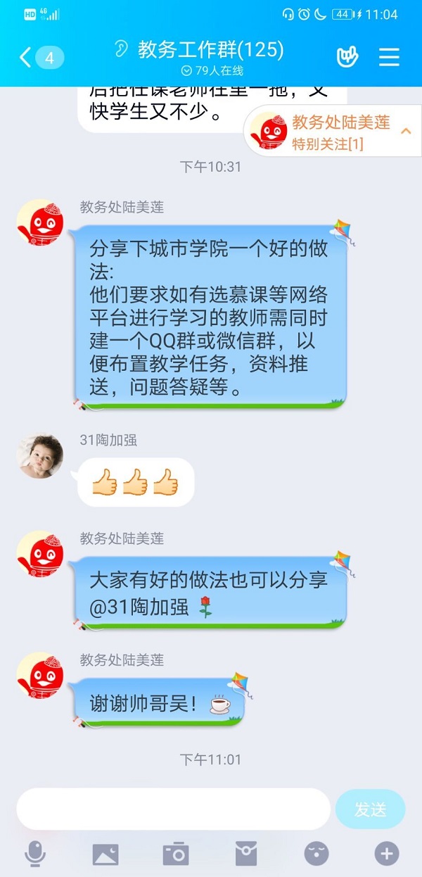 学院安排专人负责课程选课、技术指导、资源分享等各项工作。要求选MOOC与SPOC课程的老师选用网络课程进行学习的同时建立相应的QQ群或微信群便于布置教学任务资料推送问题答疑等各项工作同时在教学班组建中有督导员专业老师与学工辅导人员共同组成的教学团队,整合优质资源,保障线上教学的高质量运行。学院老师对信息化技术与教学深度融合、线上线下混合教学等有了全新的认识。