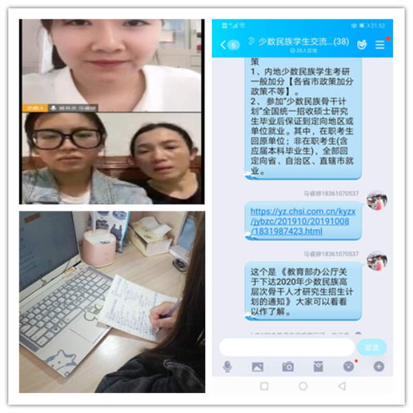 注重分类指导帮扶,构建精准育人体系。学院辅导员班主任针对学业困难学生、家庭困难学生、心理困扰学生等重点关注群体,将“云家访”与学业帮扶、就业帮扶、经济帮扶等相结合,帮助学生解决实际困难。关爱少数民族学生成长,建立“一对一”和“多对一”帮扶平台,通过开展“云座谈”、“云技能培训班”等多种方式凝聚奋进力量,浇灌民族之花。建立“学业预警库”,筛查掌握学习困难、学业成绩下滑学生的实际情况和需求,通过联系专业教师辅导、建立学业帮扶小组,实施重点学生的精准帮扶和分类指导。