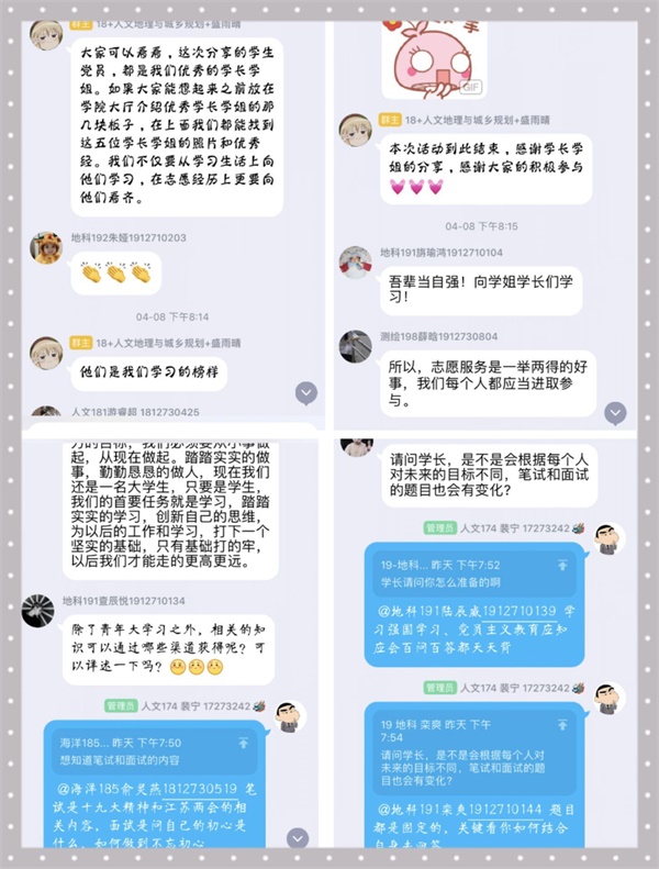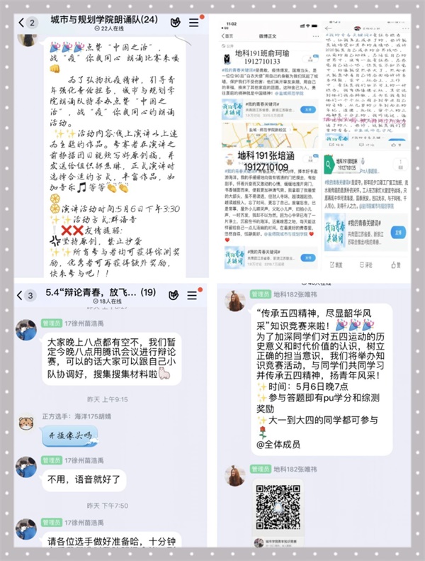 牢记初心使命。5月4日,学院团总支组织开展了“恰同学少年,风华正茂,执笔书写人生诗篇”主题活动,号召青年团员将自己的梦想和座右铭通过卡片的形式留存下来,引领广大青年团员找准自身定位,确定努力方向。同时,学院团总支书记王寅面向全体青年团员开展了“坚定信心终能取胜”为主题的线上示范团课,并在全院开展了青年大学习知识竞赛、“ 江苏新时代青年精神讨论”、辩论青春,放飞梦想“城市学院青年梦想辩论赛”等活动,以多种形式的活动引导青年团员,牢记使命,勇于担当。