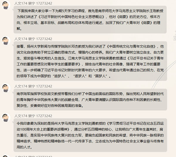 活动中,裴宁同学就培训期间的集中学习课程、实践活动和先锋骨干选拔等进行了分享。他提出在培训中使他印象最深刻的是扬州大学马克思主义学院刘勇教授的《学习贯彻习近平总书记在纪念五四运动100周年大会上的重要讲话精神》,教授通过分析五四精神的核心,让他明白广大青年生逢其时,肩负重任,是实现中华民族伟大复兴的生力军,要肩负起国家和民族的希望,将中华民族一脉相承的精神追求、精神特质和精神脉络一代一代传承下去,立志成为为中国特色社会主义事业奋斗终身有用的人才。