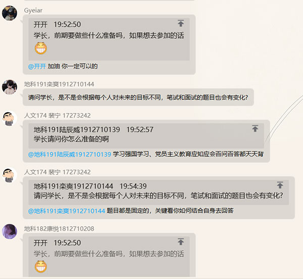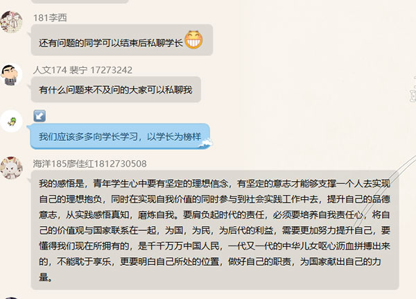 在互动环节,同学们分享了自己对五四精神的理解和作为新青年的感悟,裴宁同学鼓励同学们要珍惜时光,努力奋斗,积极进取,力争成为一名全方面发展的优秀大学生。