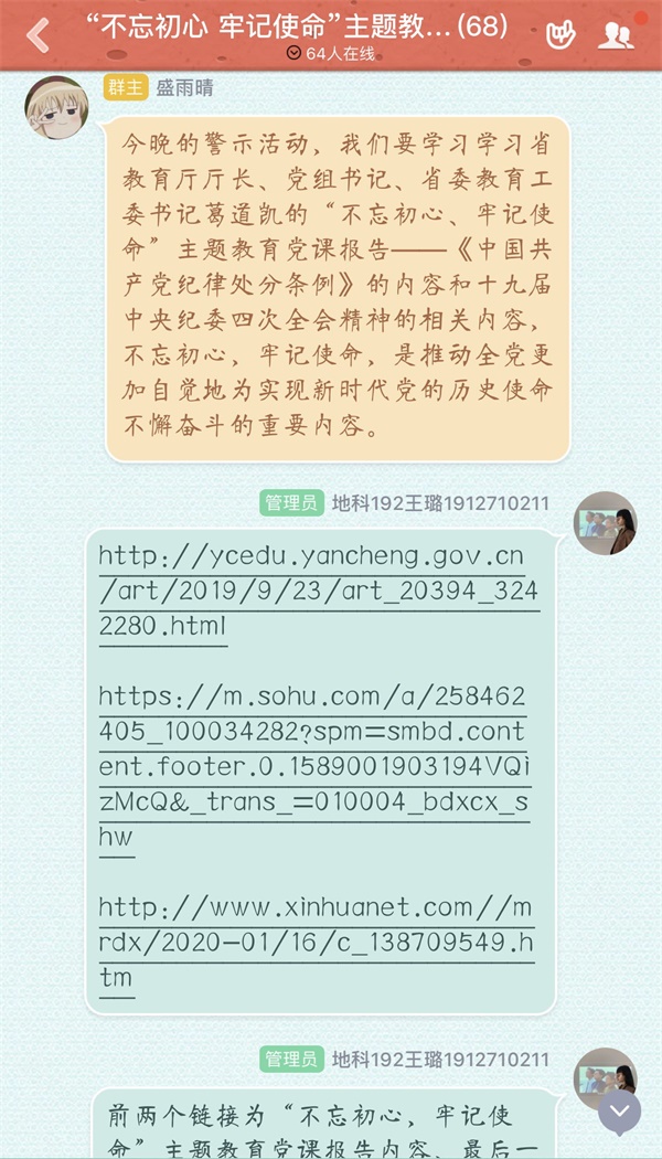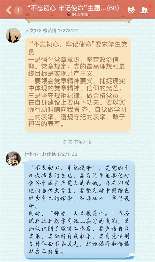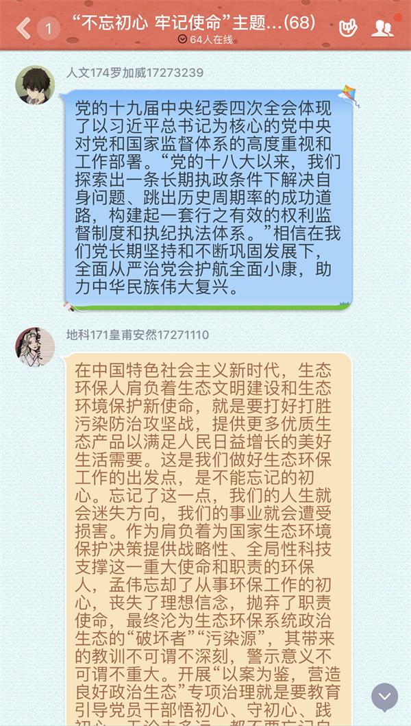 活动中,通过学习十九届中央纪委四次全会精神,观看省教育厅厅长、党组书记、省委教育工委书记葛道凯的“不忘初心、牢记使命”主题教育党课报告——《中国共产党纪律处分条例》,学生党员罗加威同学说:“遵守党纪党规要从现在做起,从自身做起,牢记信念,始终跟随党的步伐,今后要以更加严格的标准要求自己,做好表率。”