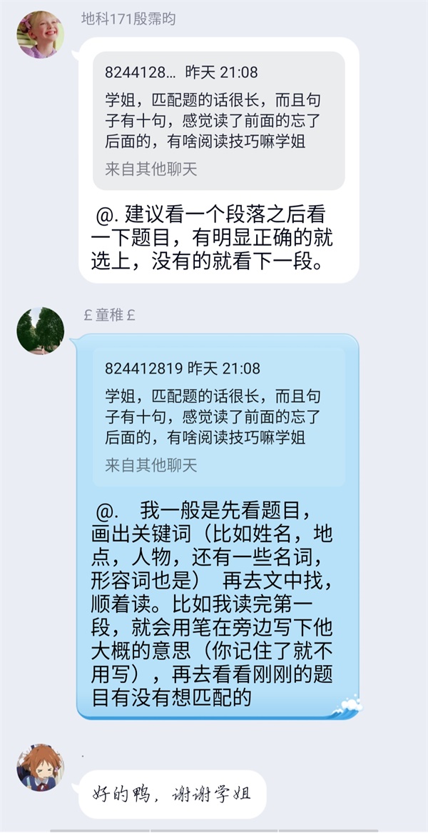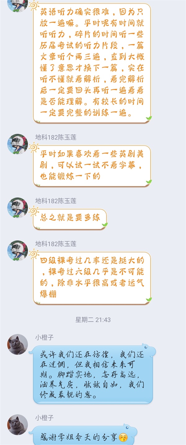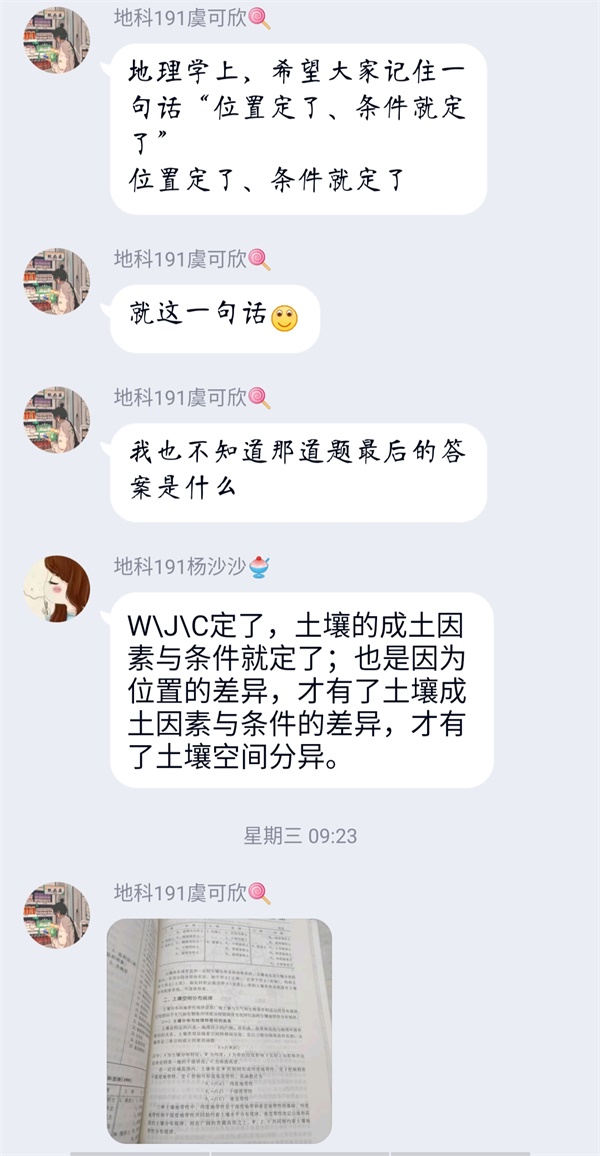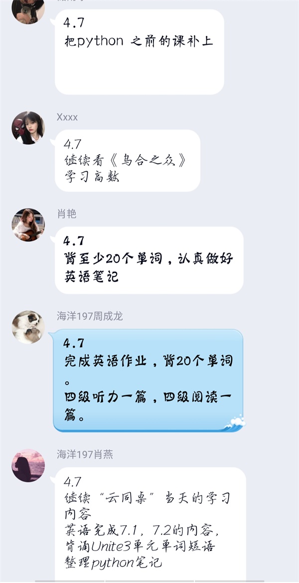 活动开始,各学习小组制定了合理的学习计划,每天按时完成任务,积极打卡,互相督促。其次,同学们在课后讨论课上的重难点,成绩优异的帮扶者针对同学们学习过程中所遇到的困惑和瓶颈,利用课余时间为同学们进行线上辅导,提供相应的学习资料,并监督学生作业。“自律更自由”学习小组组长钱晨每天上午会安排学习任务,组员按时打卡,并在每晚九点进行学习交流。此外,帮扶者分享了自己的备考经验和学习方法。例如地科172陈逸云建议计算机二级要安装最新的题库,多刷题,刷到哪题不会的就做笔记,用自己觉得容易理解的方式记下来;地科181符宇培建议同学们画大气环流图,世界洋流模式图时,要先理解掌握,再去绘图,从而达到事半功倍的效果。最后,同学们认真聆听,不断向他们请教,并进行了学习总结。活动结束后,同学们受益匪浅并且开始制定学习追赶计划,解决学习困难,迎接这学期的考试。