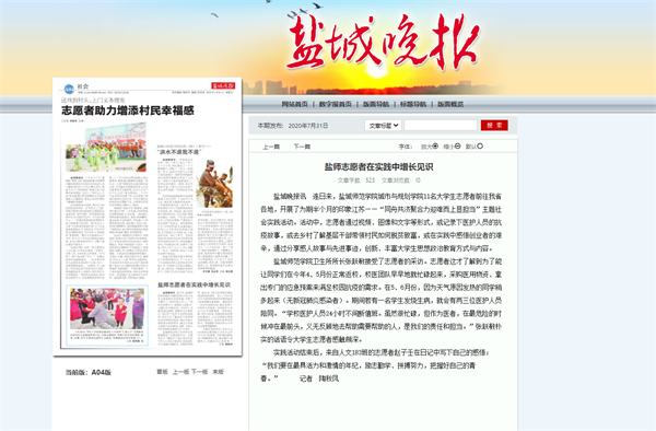 7月31日,《盐城晚报》A04版报道了城市与规划学院暑期社会实践活动:印象江苏——“同舟共济聚合力 迎难而上显担当”。