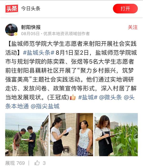 为帮助学生发挥知识技能优势,为乡村经济发展方式转变、产业布局调整、城镇建设规划等方面提供智力支持和服务,8月中旬,我院大学生志愿者来到盐城市射阳县盐东镇开展“聚力乡村振兴 筑梦强富美高”社会实践活动。