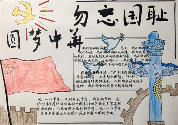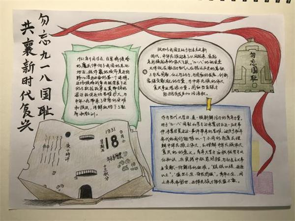 9月18日,举办“纪念九·一八”书画作品评比活动。其中地科191班张培涵同学的作品通过飘扬的红旗和寓意着和平的信鸽表达了勿忘国耻,圆满中华的壮志。人文195班庄心月同学的手抄报表现出共襄新时代复兴的斗志。同学们用形式多样、意义深厚的书画作品,歌颂了中华民族百折不挠的伟大精神,进一步激发了广大青年学生的爱国热情。