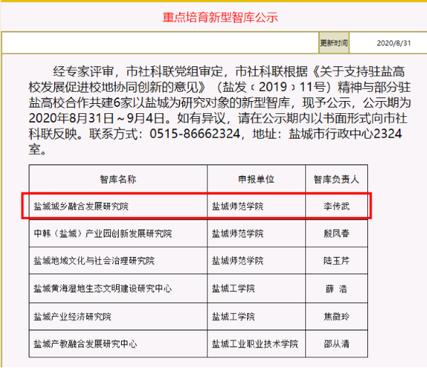根据《关于支持驻盐高校发展促进校地协同创新的意见》(盐发〔2019〕11号)要求,经学校推荐,市社科联专家评审,现立项结果已出。由城市与规划学院院长李传武教授负责的“盐城城乡融合发展研究院”名列拟立项名单。