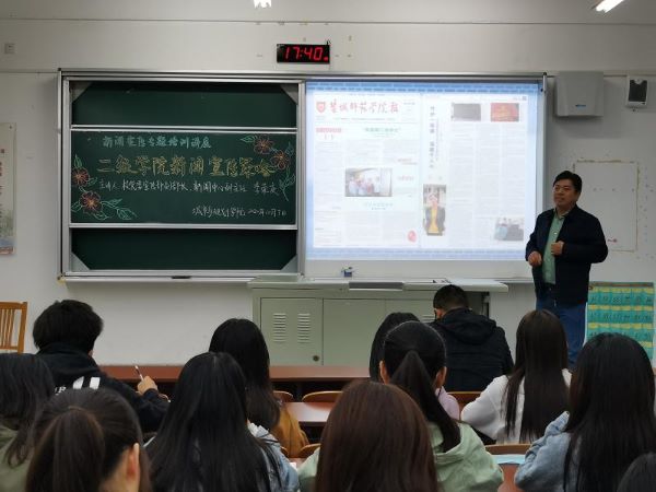 开班仪式后,李荣庆以“二级学院新闻宣传策略”为主题,结合自身多年新闻宣传工作经验,从我校媒体矩阵、宣传路径、宣传策略三方面出发,为在场师生带来了一场精彩纷呈、干货满满的讲座。他强调,在新闻宣传过程中,一是要善于发现新闻价值,注重新闻时效性、异常性、影响性、接进性、显著性、娱乐性、实用性;二是要注重新闻要素,使其具有可读性;三是让新闻有深度,引发人们思考,让人回味无穷;四是要学会让照片讲故事,通过清晰、动感、动人、创意的照片,让观者眼前一亮,提升新闻宣传效果。