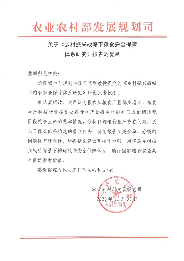 2020年,城市与规划学院充分发挥学科平台优势,致力于服务国家乡村振兴战略,助推城乡融合发展,重点打造“把论文写在祖国大地上”科研团队。今年11月-12月期间,城市与规划学院科研团队的三项标志性成果,先后获得国家政府部门及地方政府主要领导肯定性批示和采纳,形成较大社会影响,其中,《乡村振兴战略下粮食安全保障体系研究》(执笔人:王亮)调研报告获得国家农业农村部发展规划司的肯定性批示;《盐城市在中国百强城市排行版位次分析及对策研究》(执笔人:朱天明、刘丙章),《推进主城联动周边一体化高质量发展路径研究》(执笔人:朱天明、孙小祥)调研报告获得盐城市人民政府市长曹路宝的肯定性批示。