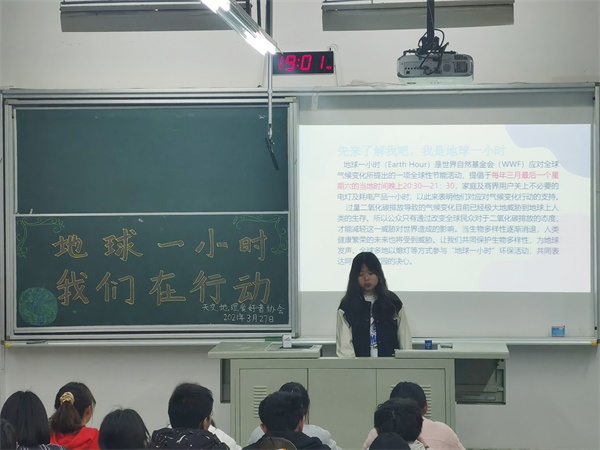 为用实际行动践行绿色低碳的生活理念,引导青年学生“为地球发声”,3月27日晚,我院天文地理爱好者协会组织开展“地球一小时,我们在行动”主题活动。