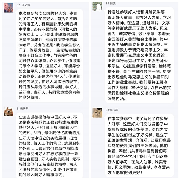 通过此次活动,同学们认识并了解到盐城43位中国好人、62位江苏好人、228位盐城好人的先进事迹,真切地感受到满满的正能量;同时也让同学们树立了正确的人生观和价值观,这为同学们今后的工作和学习生活带来了明确的目标和深刻的启发。(文:王笑如;图:徐娜;审核:杨珊珊)