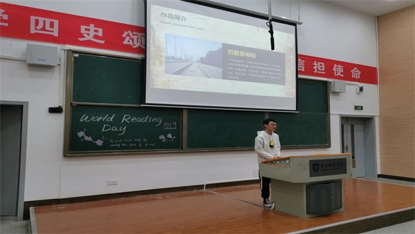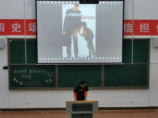 活动伊始,主持人陈雅丽同学阐明了此次活动的意义,拉开活动序幕。随后,参加此次活动分享的同学以丰富的形式展现了世界读书日的主题,其中有同学介绍了《巴黎圣母院》《小妇人》等世界名著拍摄而成的英文电影;有的用流利的英文作开场白推荐了《看不见的客人》《楚门的世界》等寓意深刻的英文电影;另外,有的同学不仅推荐了英文流行金曲还展示了即兴演唱,增加了大家的听觉享受的方式。此次主题分享活动,在拓宽大家的知识面的同时,也点燃了大家学习英语的热情。参加此次活动的范天琪同学表示,在筹备分享内容的过程中提升了自己的英语能力,她认为:“作为听众的同时也在耳濡目染中了解到自己的欠缺和不足,台上即兴演唱更是对自己综合素质和应变能力的考验。”