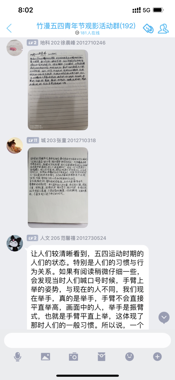 此次活动分为两部分,分别为线上活动群观影活动,以及主题海报设计大赛。观影活动于5月4日晚七点进行,首先组织学生观看五四革命历史电影片段、学习爱国主义精神。随后,同学们都非常积极的在群里分享自己的感想,其中徐晨峰、张童和范馨禧三位同学对于五四精神的理解入木三分,引起了大家的强烈共鸣。主题海报设计大赛活动邀请了同学们发挥自己的想象与才能,表现出自己心中对于五四精神的理解。活动结束,收到了大量来自同学们的投稿,多数作品都展现了青春精神、活力四射,经过评选,大家一致认为沈丁元、李欣彤等同学的作品最有创意、有自己的风格,所以评为特等奖。