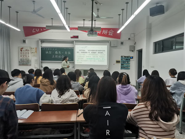 各班主题班会形式多样、内容丰富。地科192班从习近平总书记在清华大学的讲话引出班会内容,引导同学们思考诚信、感恩、自强赋予新时代青年大学生的新意义,192班长王笑如说道:“知感恩,讲诚信,我们将传承文明努力将自己培养成一名具有文明素养、感恩情怀和诚信美德的高素质人才”。地科203班则从班级建班以来的班级具体情况、学生获奖内容、个人志愿服务等方面作出了具体总结,并请班级同学以“感恩乡村,奉献乡村”为题进行了演讲。许多参会的同学都有感而发,书写下了自己对“诚信·感恩·自强”精神的感悟。