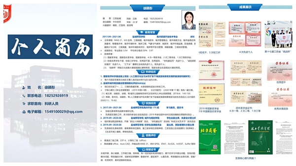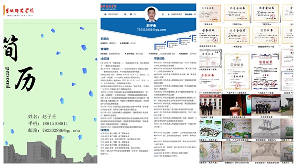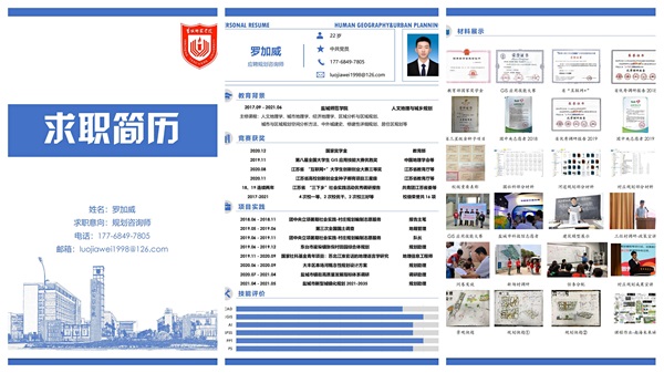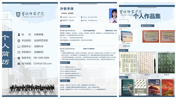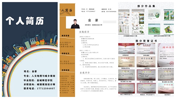 本次的简历设计大赛中,我院的同学踊跃投稿,每份简历都能精准地涵盖个人特长,获得荣誉,求职意向等多个方面,充分体现了同学们的缜密思维和生涯规划。其中,人文174班的罗加威简洁明了而又不失大气的设计风格,搭配上丰富的科研竞赛、社会实践经历,高质量作品集格外引人注意。地科1910班的孙敏季捷以盐城师范的地标为背景,突出其毕业院校,而后再展示自己。地科203班的谢国瑞则先强调简洁与一目了然,他认为想让应聘单位更好的了解到自己,就需要做到简历的简洁与层次分明,这样才能让招聘负责人第一时间了解到自己的优势所在,增加自己求职成功的可能性。