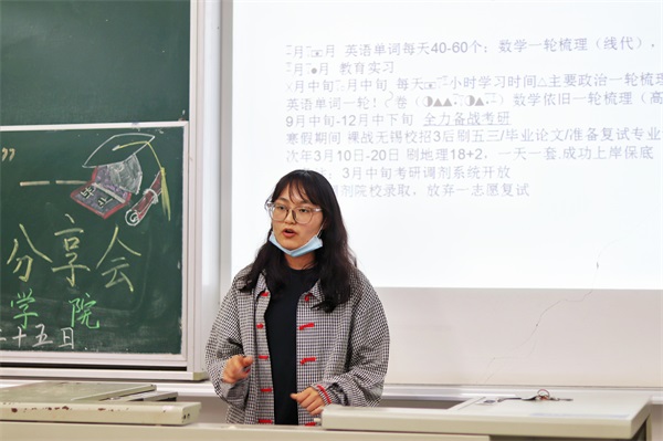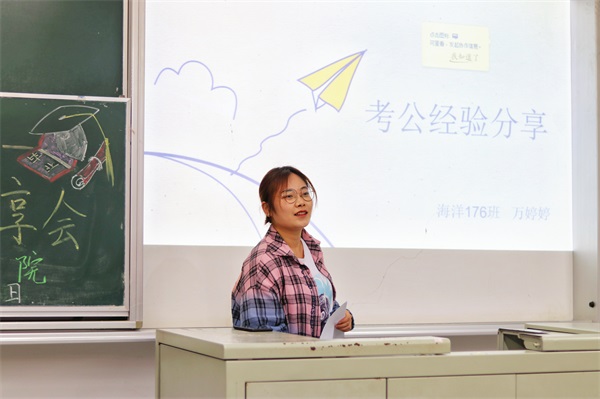 在活动中,万婷婷结合自己考取公务员的情况,从备考统筹与计划实施两个方面提出建议:备战考公,需要根据考试的重点,制定自己的学习进度与复习计划,并且要拥有高效的执行力,踏实背书,多做真题,才能向着考公之路不断迈进。以432分考入中国矿业大学资源与环境专业的苗浩禹,推荐较为有效的英语单词识记方法,并着重分享了他自己对高数复习的时间安排与复习方法,鼓励低年级同学在考研路上一定要耐住孤苦踏实前行。同时考取江苏师范大学研究生和响水县教师编制的张舟,结合自己的备考经历,分别分享了自己的考研考编经验。她表示考研与考编并不冲突,关键是在于平时要有高效的安排,相信自己平时的积累,认真准备定能成功。人文194班石想同学表示:“听了学长学姐的分享,自己对如何备战考研有了更清晰的规划。在看到苗学长晒出的打完的摞得高高的草稿纸后,明白了自我约束以及努力的重要性。”