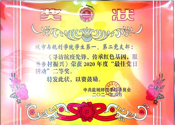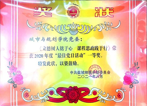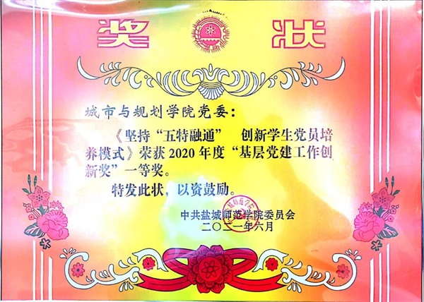 城市与规划学院党委荣获2018-2020年度先进基层党组织;学院党委申报的“坚持‘五特融通’ 创新学生党员培养模式”项目获2020年度基层党建工作创新奖一等奖;学院党委申报的“立德树人铭于心 课程思政践于行”主题党日活动获2020年度最佳党日活动一等奖;学生第一、第二党支部申报的“寻访抗疫先锋 传承红色基因 服务乡村振兴”主题党日活动获2020年度最佳党日活动二等奖;城市与规划学院教工第一党支部获学校特色党支部;吴恒仲、刘玉卿、韩爽、徐颖彤(学生)获2018-2020年度优秀共产党员;王寅获2018-2020年度优秀党务工作者称号。