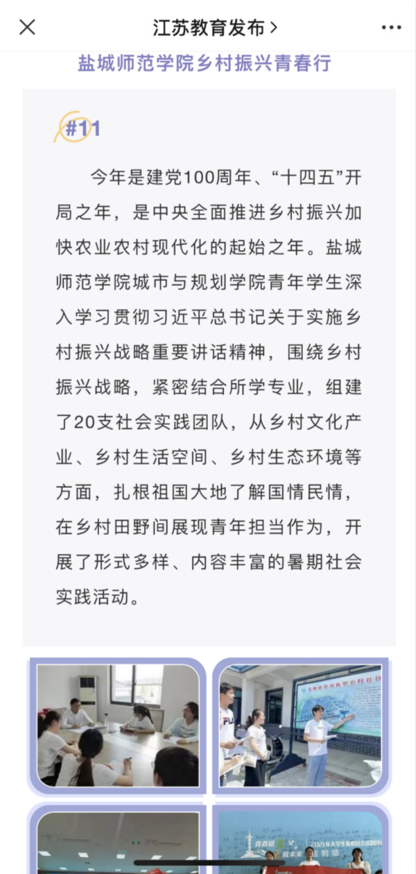 8月21日,江苏省教育厅官方微信《江苏教育发布》以图文形式报道了我院“乡村振兴青春行”暑期社会实践活动。