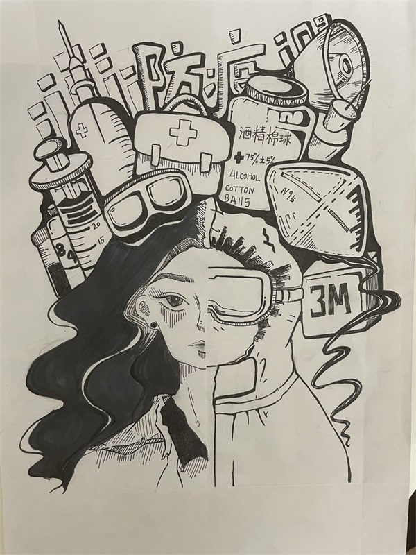 人文215班的孙简则选择用画笔记录下她眼中的防疫行动:“这幅画灵感来源于一些黑白线描装饰画作品,粗细线条搭配有可以突出强调一些有关防疫的元素。画面的主体是一位医护人员,在生活中她已经是个很美的女孩,但在抗疫防疫的过程中,穿上防护服的她更是有一种别样的光辉。我们看到在防疫抗疫过程中有很多很多这样的女孩,或许很年轻,或许很渺小,但她们的敬业和付出值得我们去歌颂。”