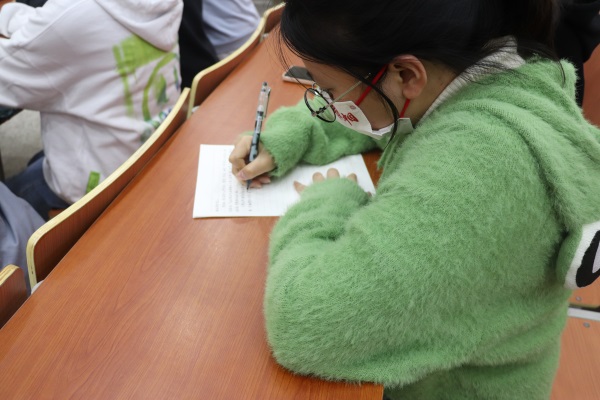 活动伊始,主持人邀请了两位优秀大三学姐分享她们的大学生活和活动经验,其中地科191班李欣彤从生活学习各个方面给新生阐述,建议新生找准人生方向,用四年变成更加美好自信的自己,把握住每次机会让自己的大学生活变得更加丰富多彩。海洋197班肖燕主要分享了自己参加的活动及比赛的经验,同时呼吁同学们借此机会,科学规划自己的未来,不负春光、不负韶华,努力学习、脚踏实地,做理想、有本领、有担当的时代新青年。活动的最后,同学们纷纷拿起笔书写下对未来满满的希冀,有的同学为四年后的自己定下了不凡的目标与理想;有的同学希望未来在开启这封信件的时候已经有所收获、有所成长;还有的同学通过这封信留下现在的期许,定格目前的记忆,留下美好回忆。