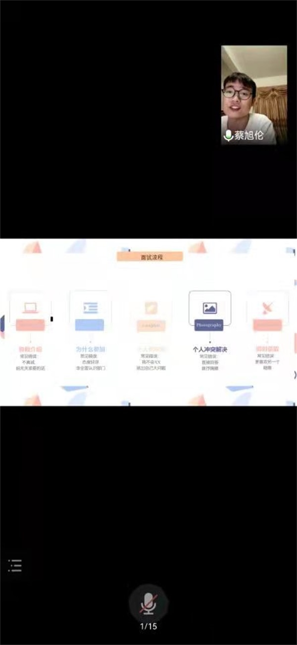 会议开始,生涯规划部工作人员、海洋207班苏畅同学简单介绍了我校学生组织情况及本次活动主要目的。随后,海洋196班蔡旭伦同学从面试的流程角度入手,详细地解释了面试中自我介绍时的注意点:要真诚,不说无关紧要的话;同时又让同学们进行反思,明确自己面试的目的,多问问自己为什么要参加这个组织和社团;接着,他向同学们提出面试的大忌,要正确的认识到自己的优缺点;最后是最为精彩的线上模拟面试环节,来自地科213班的尤晓波同学首当其冲,模拟面试结果非常的出色,同时部分其他参会的同学也给尤同学提出了一些个人建议,给同学们留下了深刻的印象。