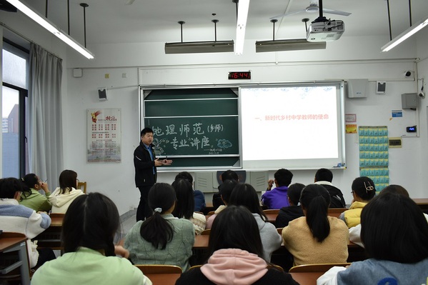 为促进2021级新生对所学专业的认识和了解,让新生更快地明确学习目标与方向,合理规划大学生活,11月19日16时,我院在城资楼A213组织开展地理科学(乡村定向师范)专业介绍会,本次介绍会由副院长张华兵担任主讲人,地理科学(乡村定向师范)专业全体新生和班主任参加了此次介绍会。