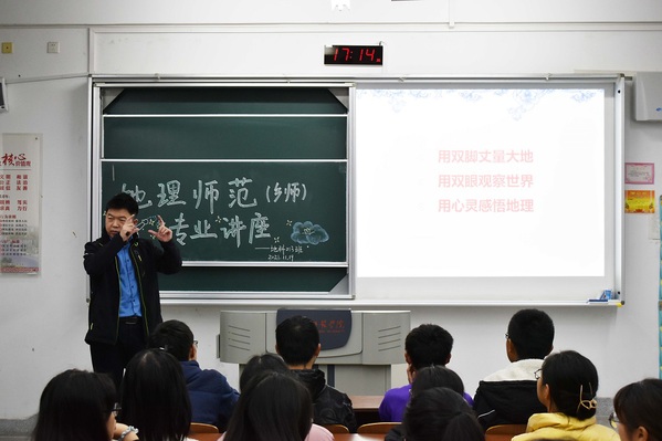 讲座伊始,张华兵以“新时代乡村中学教师的使命”为切入点,强调乡村定向师范生肩负的振兴乡村教育的重要使命。接着,他从“什么是大学”“大学生活应该怎么过”两个问题回答了大学的生涯规划,并希望同学们的大学生活是一个有目标的大学生活、有计划和行动的大学生活,更是一个胸怀“孝道”与“感恩”的大学生活。与此同时,张华兵对专业的困惑和出路进行了详细的解读。最后,张华兵希望全体学生能够“用双脚丈量大地”“用双眼观察世界”“用心灵感悟地理”。