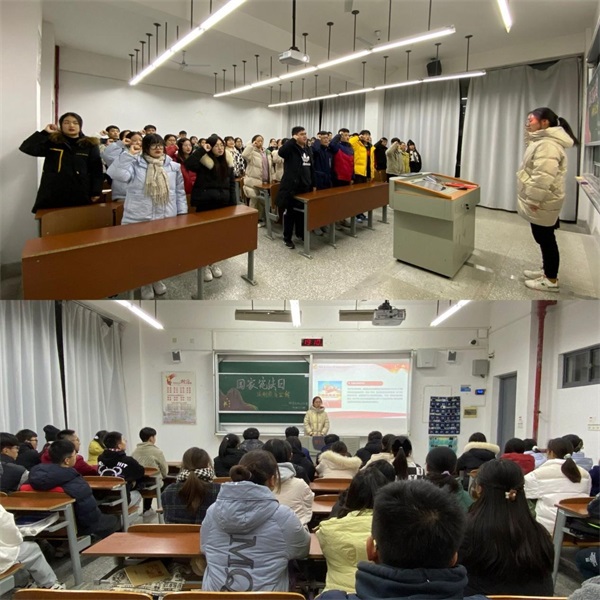 在主题教育活动期间,学院组织各班级召开“国家宪法日”主题班会,从国家宪法的性质与地位切入,阐述了国家宪法日的由来和标准意义,使同学们明白国家宪法日的设立旨在帮助国家落实依宪治国,普及宪法知识,落实《决议》,扩大国际影响。同时,组织同学们观看宪法宣传片,并举行“向宪法致敬”宣誓仪式。