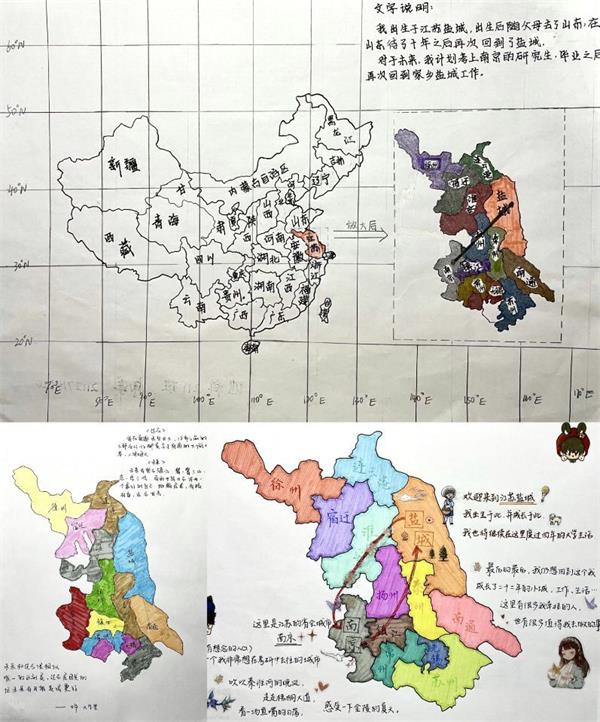 本次活动要求同学们运用A4纸或是小黑板绘制一张完整的地图,地图上面标注自己的家乡、美丽的盐城以及未来考研或工作所在地。巧妙的用一条线把它们串联起来,在地图旁简要地阐述自己的成长历程和未来规划。在本次活动中,同学们积极参与,热情高涨,都交出了一份完美的画卷。