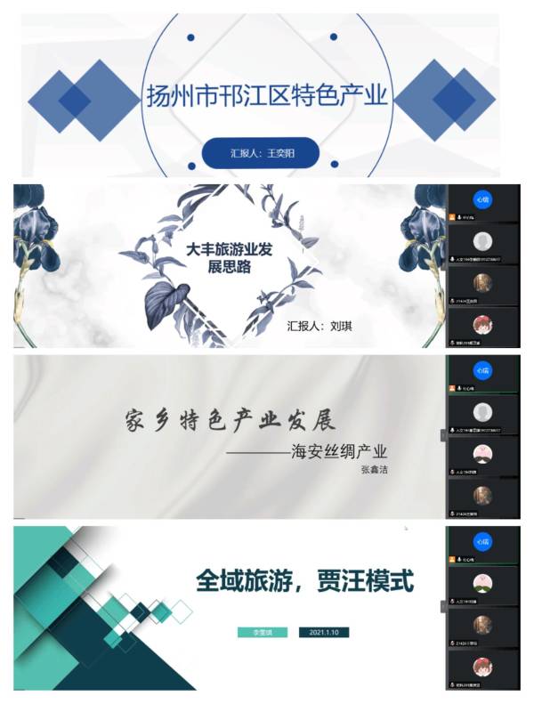 此次实践活动由四个小组同步进行,各小组分别对扬州、南通、盐城、徐州四个城市各自具有的特色产业,如旅游业、纺织业、丝绸产业等进行深入了解,分析各个城市所具有的区位条件,梳理出产业发展所具有的不足和问题,深入挖掘产业的基础与优势所在,并以小组为单位通过归因分析提出各自的建议和策略。在此期间,同学们在网上查阅大量资料,积极讨论交流,拓展思路,展望前景。