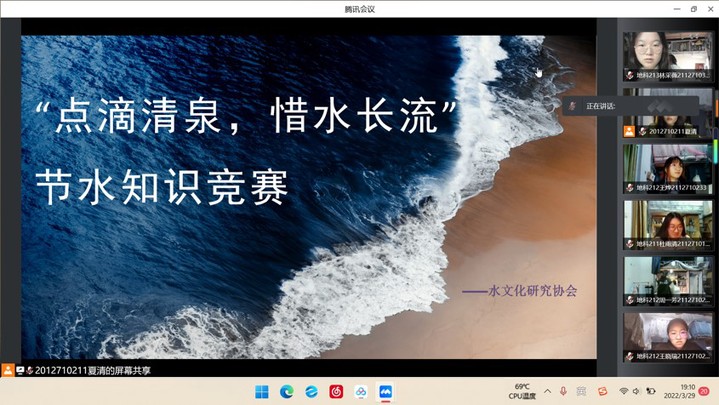 活动开始,夏清首先向同学们讲解节约用水的重要性和必要性,接着公布竞赛规则。竞赛共分为单选题、多选题两个部分,题目内容包括我国基本水情、节约用水政策与法律法规、农业工业节约用水知识、城镇生活与服务业节约用水知识等。线上竞赛气氛严肃不失活泼,三十名选手积极踊跃答题。经过激烈的角逐,最终以积分制的形式评选出一等奖一名,为地科211班的唐欣茹;二等奖三名,分别为地科211班的杜雨清、地科213班的卢贝宁、地科213班的秦源。赛后地科213班的卢贝宁同学表示:“这次活动通过线上交流及竞赛的形式,让我们进一步了解了例如水资源管理条例等节水知识,在今后生活中我们一定要从点滴做起,加入到节约用水的行列中来。”