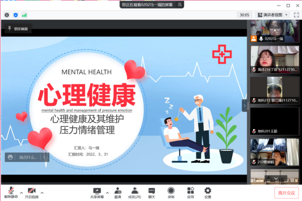 本学期伊始至今,为保证本院学生的安全及配合疫情防控工作,我院采取了线上授课,在封闭式管理下,学生的心理健康往往会出现一定的波动。心理委员作为连接学院与班级之间的桥梁,是反映各班学生心理状况的重要渠道之一,所以提高心理委员的思想认识水平与能力就显得格外重要。因此,3月31日,我院学生会素质拓展部开展 “3·20春季心理健康教育系列之心理委员线上培训会”活动。