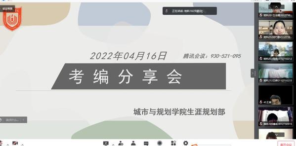 为帮助同学们及时掌握最新的考编政策、明确备考方向,4月16日晚,我院举行2022年考编经验分享交流会,本次活动邀请2022届毕业生王心怡、刘韵文、邓戬、张静琪为同学们分享考编经验。本次活动采用线上会议形式举办。