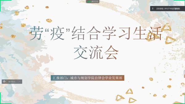 为缓解封校焦虑,加强同学们的线上学习的自律性,我院学业发展部于4月14日晚通过腾讯会议举行劳“疫”结合学习生活交流会的活动,并于线下开展vlog征集活动,制作宅家或者校园生活的点滴,发现生活的美好,在忙碌自律的生活中获得放松和愉悦。