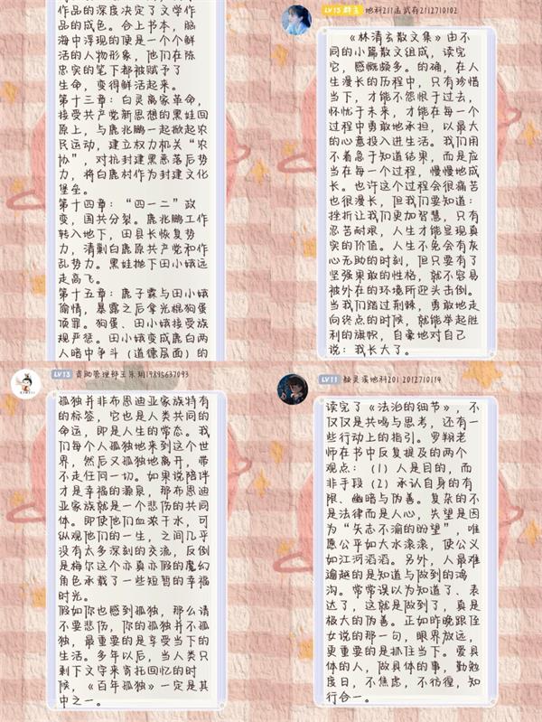 本次的活动吸引了大批同学的积极参与,很多同学平日里都喜爱阅读,并借此次活动机会与更多的同学分享自己的读书心得。其中,人文215班的杨思雨同学向其小组成员们介绍并推荐了她所喜欢的作家西洲,通过阅读西洲的作品,她可以感受到属于春天的随心与率性,在最美的人间四月天里有趣有盼,热爱生活。地科202班的吴欣怡同学向成员们分享了费孝通先生的《乡土中国》,在她介绍完书中费先生讨论的问题后,我们可以深刻的感受到乡村社会中的文化深厚,感悟民族从土里长出的光荣历史。地科212班的蔡文静,曹莹莹以及朱梓仪三位同学就羽生结弦这名花滑运动员的经历进行了讨论分享,在他身上那一种为梦想不断拼搏努力,直面困难永不言弃的精神值得我们所有人去学习。