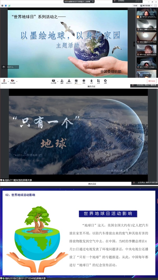 活动期间,同学们积极参与腾讯会议线上分享会,地科203班张芯源同学的分享不仅让我们详细了解的世界地球日由来和影响,还结合自身实际向大家提出实用的环保小建议,让我们明白讲好地球故事是作为当代青年的责任与担当。通过本次分享会,大家对于世界地球日的由来和意义、绿色低碳的生活方式以及疫情当下的人地关系都有了基本的了解和认知。此外,同学们还积极绘制手抄报、海报,通过卡通的地球形象和鲜亮的色彩搭配呼吁大家身体力行,爱护我们的地球母亲,保护我们的生存家园。