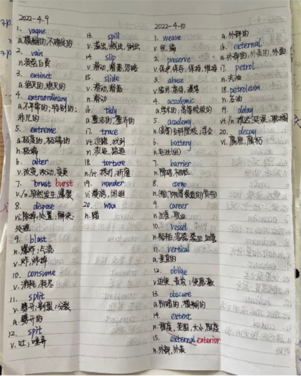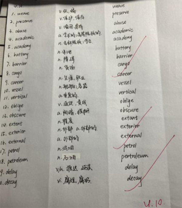 活动中,同学们积极投入到背单词的活动中,每天完成单词学习任务后仔细核对单词,认真做出反馈且都能坚持上传学习记录。在完成规定的学习计划之余,许多同学都能主动查漏补缺,根据自己的计划安排,认真备考四六级。此次活动持续21天,每位同学都充分显示出对本次活动的重视,字迹工整,态度端正,每位同学都能积极监督身边的同学,共同勉励,营造了良好的学习氛围。活动中,同学们主动配合,及时反馈,协会成员也积极听取意见,改善打卡机制,认真核实信息,这使得活动效率不断提高,同学们的参与热情也不断高涨。