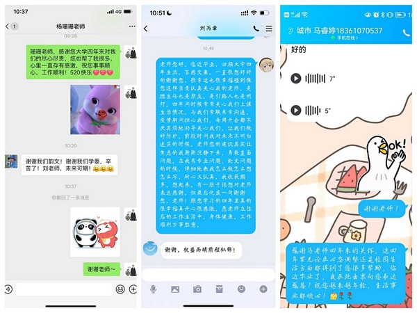 本次活动以2022届毕业生送便签、短信、电话祝福语的形式展开。一条条温馨的祝福语中饱含的是同学们对老师真挚的感谢和敬意,也饱含着大学四年生活的点点滴滴,和与老师们相伴偕行的朝朝暮暮。与此同时,同学们纷纷对老师道出了往日难以流露的真情,感恩相识,不负遇见,继续前行,未来可期!