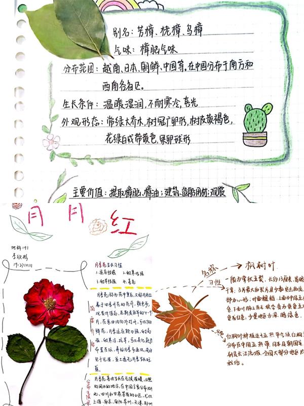 此次活动线上线下同步进行。参与者可利用落叶通过拼贴、拓印、手工或者绘画方式完成植物标本的制作,并标注植物习性以及所分布的气候区。此外,同学们通过详细介绍植物的特性及其背后的地理意义,详实的文字标注,生动的讲解与介绍让同学们身临其境。以此让同学们从不同角度感受大自然变化,彰显了我院学子的地理学科素养。
