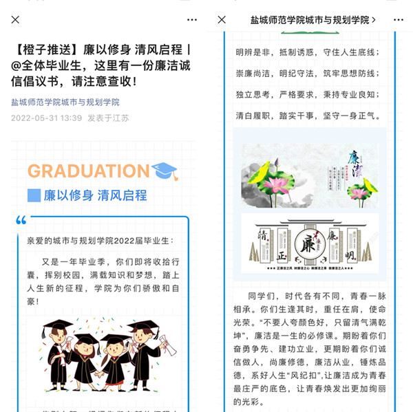 送一份廉洁微礼物 “亲爱的同学们,你们即将收拾行囊,踏上人生新的征程,期盼着你们奋勇争先、建功立业,更期盼着你们诚信做人,尚廉修德,锤炼品德,让廉洁成为青春最庄严的底色,让青春焕发出更加绚丽的光彩。”在离校前,城市学院全体2022届毕业生收到了学院发来的廉洁诚信倡议书,一份沉甸甸的毕业礼物。