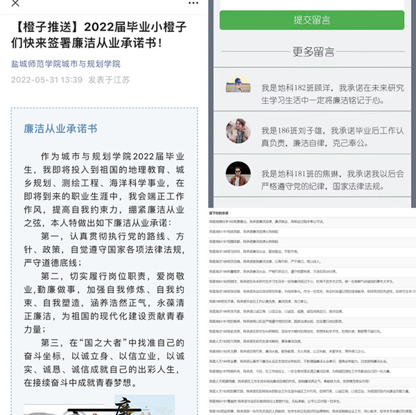 留一篇廉洁云承诺 在毕业生离校之际,学院通过微信公众号推出“云”端廉洁从业承诺签名,提高毕业生廉洁诚信意识,系好人生“风纪扣”。小小的签名,是毕业生对今后勤勉敬业、廉洁自律的慎重承诺,也是毕业生争做廉洁从业的践行者、诚信立世的宣传者、幸福人生的开创者的坚定信念。