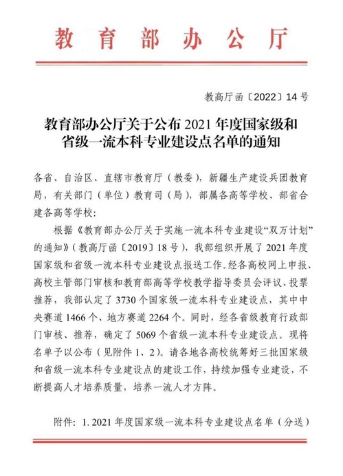 近日,教育部办公厅正式发布了《关于公布2021年度国家级和省级一流本科专业建设点名单的通知》(教高厅函〔2022〕14号)。我院地理科学专业成功入选国家级一流本科专业建设点,成为必发集团welcome欢迎光临2021年4个获批的国家级一流本科专业建设点之一。