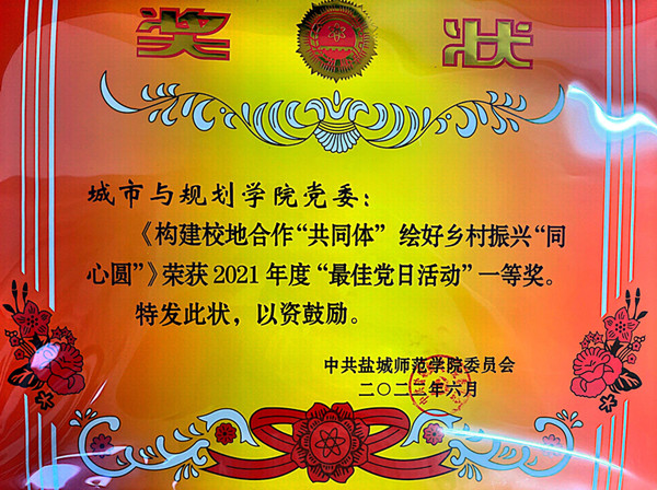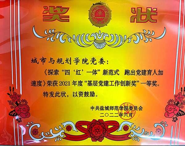 城市与规划学院党委申报的“探索“四‘红’一体”新范式 跑出党建育人加速度”项目获2021年度基层党建工作创新奖一等奖;申报的“构建校地合作‘共同体’ 绘好乡村振兴‘同心圆’主题党日活动获2021年度最佳党日活动一等奖,这是学院党委继获得2021年度“党的建设奖”之后获得的多项殊荣。