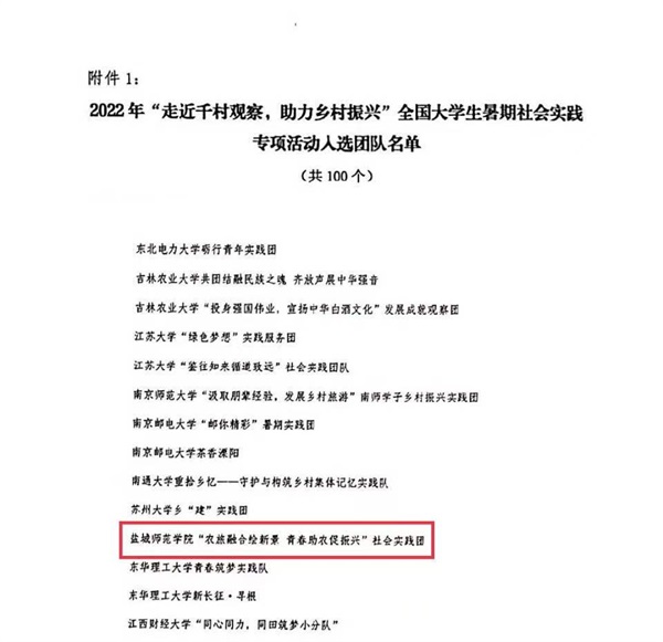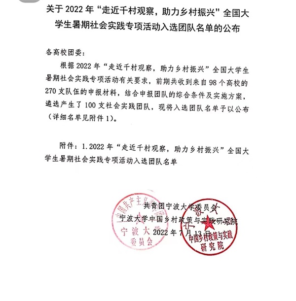 近日,2022年“走进前村观察,助力乡村振兴”全国大学生暑期社会实践专项活动入选团队名单出炉,从98所高校的270支队伍共遴选产生100支社会实践团队,我院 “农旅融合绘新景,青春助农促振兴”社会实践团成功入选。