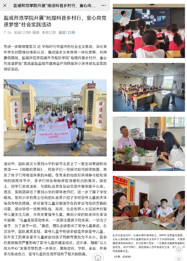 7月27日,《盐城123网》报道了城市与规划学院“地理科普乡村行,童心向党逐梦想”实践团赴盐城市建湖县芦沟镇裴刘小学开展社会实践调研活动。