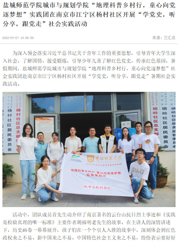 7月27日,《交汇点新闻》报道了城市与规划学院“地理科普乡村行,童心向党逐梦想”实践团走进江宁区杨村社区进行暑期社会实践活动。