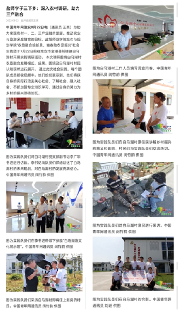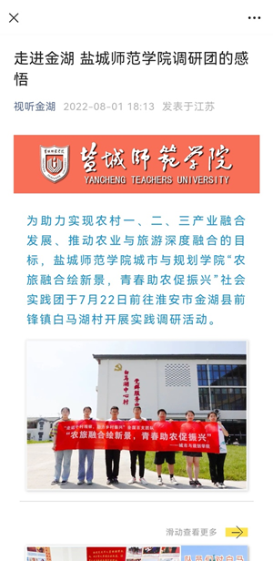 原文如下:为助力实现农村一、二、三产业融合发展、推动农业与旅游深度融合的目标,必发集团welcome欢迎光临城市与规划学院“农旅融合绘新景,青春助农促振兴”社会实践团于7月22日前往淮安市金湖县前锋镇白马湖村开展实践调研活动。
