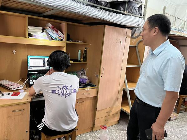 为了解新生的线上学习情况,确保新生入学教育的各项工作有序平稳展开,9月6日上午,院党委副书记吴恒仲带领辅导员、新生班主任深入新生宿舍检查新生线上听课情况。