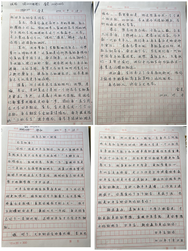 学院全体新生积极参与青春信箱活动,面对饱含着对未来自己的期待和对美好生活向往的信件,大家的态度郑重且认真。地科223班的何菁岚满怀憧憬地在信件中提到:“未来的你一定是考研成功大队或考编成功大队的一员了吧!”。地科221班李志浩同学则决心成为一名优秀的人民教师,为祖国作出贡献,她在信中谈到:“在假期中我也会怀着谦卑上进的心态,努力学习专业知识”。在这个充满挑战的时代,同学们能够有条不紊地规划未来,慢慢理清自己在人生旅途中每一个阶段想要达到的目标,使得自己的学习生活更加有方向感,相信他们一定会在未来大放光彩!